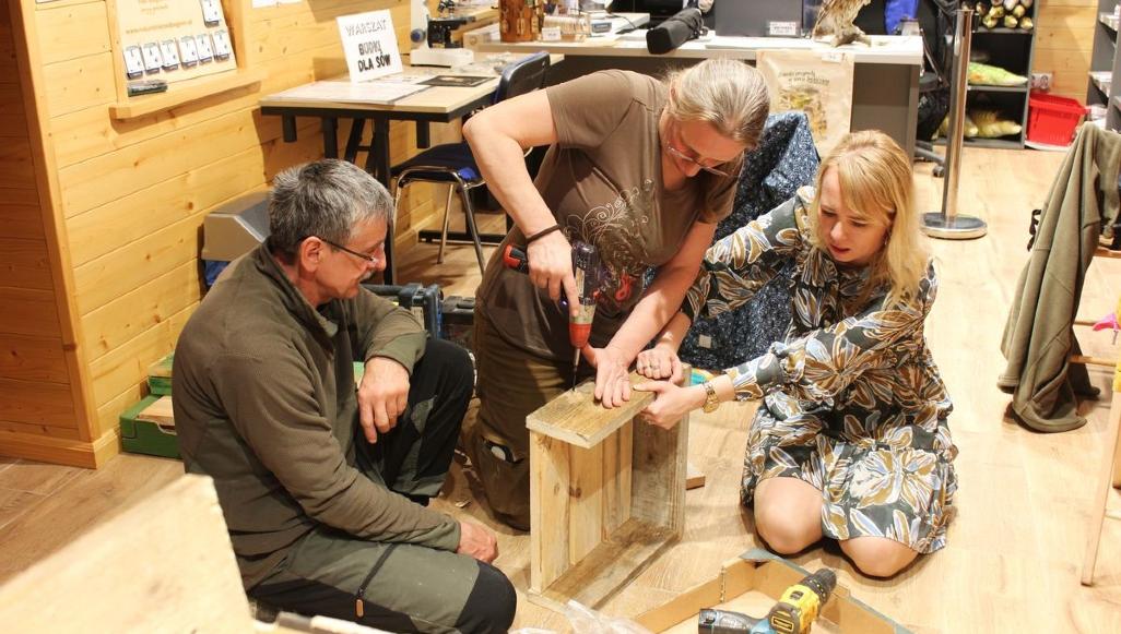 Następnie odbyły się warsztaty – można było tworzyć sowy z koralików, wyplatać sówki ze sznurków, a miłośnicy majsterkowania budowali budki lęgowe dla pójdźki, puszczyka i uszatki. W tym zadaniu przewodnikiem i instruktorem był Jerzy Sikorski.