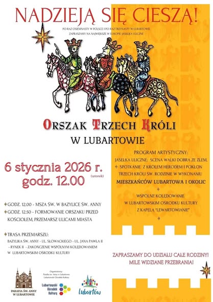 Uroczystość rozpocznie się Mszą św. w Bazylice św. Anny, a następnie orszak przejdzie ulicami Słowackiego, Jana Pawła II i Rynek II. Podczas przemarszu odegrane zostaną krótkie sceny nawiązujące do biblijnej historii narodzenia Jezusa, w które zaangażują się mieszkańcy Lubartowa i okolic. Finał wydarzenia będzie miał miejsce w Lubartowskim Ośrodku Kultury, gdzie zaplanowane jest wspólne kolędowanie z kapelą „Lubartowianie”.We wtorek wieczorem, również 6 stycznia o godz. 18.00, Lubartowski Ośrodek Kultury zaprasza na Koncert Noworoczny Orkiestry Dętej OSP Lubartów. Wstęp wolny.